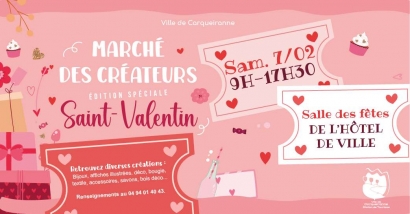 - Marché des créateurs, édition spéciale Saint Valentin le 7 février à Carqueiranne Tous publics Marché des créateurs, édition spéciale Saint-ValentinLa Ville de Carqueiranne propose son marché des créateurs édition spéciale « Saint Valentin » le samedi 7 février 2026 de 9h à 17h30 en salle des fêtes de l?Hôtel de Ville. Le 7 février à Carqueiranne. samedi 07 février Centre Ville Carqueiranne