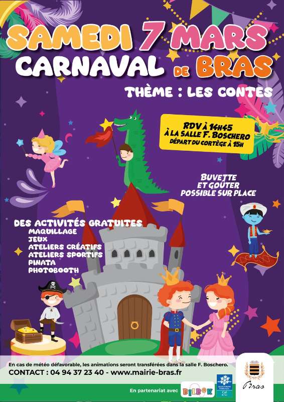 gratuit en famille carnaval Festivités gratuit Carnaval - Bras Le 07/03/2026 Publié par Sylvie B le 12/02/2026 par quefaireenfamilledanslevar 12/02/2026 La commune invite petits et grands à venir participer au traditionnel Carnaval, le samedi 7 mars. Le Carnaval claque la porte à la saison hivernale pour l'ouvrir bientôt au printemps ! C'est une des premières manifestations extérieures de l'année, pour l'occasion les rues s'animent et prennent les couleurs de la créativité de chacun, costumes sophistiqués ou de papier, tous arborent fièrement leurs déguisements et suscitent notre admiration, associations, professionnels, écoles, particuliers... c'est l'imagination qui défile ! Au programme à Bras : La commune invite petits et grands à venir défiler lors du traditionnel Carnaval, le samedi 7 mars 2026. Cette année, princes charmants, grenouilles, dragons, princesses, pirates... seront de la partie ! Au programme : - un défilé déguisé- des activités gratuites (maquillage, jeux, ateliers créatifs et sportifs, photobooth, piñata...)- Buvette et goûter sur place possible. RDV à 14h45 devant la salle F. BoscheroDépart du cortège à 15h En cas de météo défavorable, les animations seront transférées dans la salle F. Boschero. En partenariat avec l'Accueil de Loisirs de Bras et l'association Bilbok83 C'est la saison des Carnavals en Paca ! Découvrez les dates des Carnavals de la région. Tous publics samedi 7 mars 2026 14h45 Tous publics Village Bras FacebookTwitterEmail A découvrir également Que faire pendant les vacances de février avec les enfants ? Que faire avec des enfants à Toulon ? 10 idées de sorties en famille Carnavals d'ici et d'ailleurs, une exposition à découvrir en famille dans le Var Les Studios Rembrandt pour expérimenter en famille à Draguignan Palomano ouvre à Puget-sur-Argens un nouveau parc ludo-éducatif pour les enfants ! Sur la Côte d'Azur, 40 musées et monuments ouvrent grand leurs portes lors de Mon Week-end aux Musées De belles chutes de neige dans les Alpes du Sud : La météo des neiges de ce weekend du 10 et 11 janvier La météo des neiges de ce weekend du 3 et 4 janvier Les programmes des festivités de Noël durant ces vacances dans les Alpes du Sud