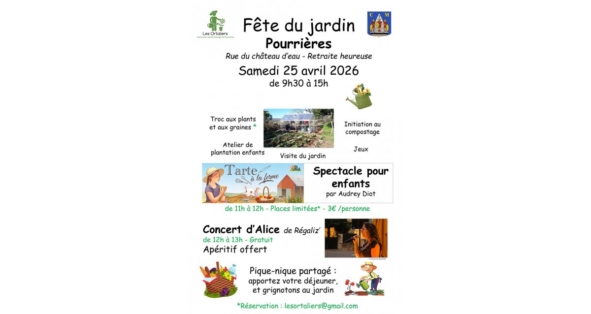 en famille Jeune public ateliers - stages festival Fête du jardin : troc aux plants, visite, ateliers enfants Le 25/04/2026 Publié par Jean-Baptiste Fontana le 24/04/2026 par quefaireenfamilledanslevar 24/04/2026 Le 25 avril 2026, à Pourrières, profitez d'une journée au jardin avec diverses activités. Venez profiter d'une journée au jardin avec troc de plants et aux graines, ateliers pour enfants, visite du jardin, initiation au compostage et jeux. Un spectacle pour enfant et un concert sont également au programme (participation 3€), suivis d'un pique-nique partagé. Tous publics Plus d'informations samedi 25 avril 2026 De 9h30 à15h. > 15:00 Gratuit, sauf spectacle pour enfant : 3€ Tous publics Centre Ville Centre ville Pourrières FacebookTwitterEmail A découvrir également Vacances de printemps dans le Var et les Alpes-Maritimes : le guide des sorties en famille Samedis en fête revient le 4 avril à Toulon avec Baleti, chasse aux oeufs, parades, animations... Que faire pendant les vacances de février avec les enfants ? Que faire avec des enfants à Toulon ? 10 idées de sorties en famille Carnavals d'ici et d'ailleurs, une exposition à découvrir en famille dans le Var Les Studios Rembrandt pour expérimenter en famille à Draguignan Palomano ouvre à Puget-sur-Argens un nouveau parc ludo-éducatif pour les enfants ! Sur la Côte d'Azur, 40 musées et monuments ouvrent grand leurs portes lors de Mon Week-end aux Musées De belles chutes de neige dans les Alpes du Sud : La météo des neiges de ce weekend du 10 et 11 janvier