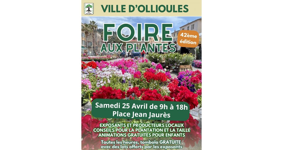 gratuit en famille salon - foire 42e édition de la Foire aux Plantes Le 25/04/2026 Publié par Jean-Baptiste Fontana le 24/04/2026 par quefaireenfamilledanslevar 24/04/2026 Rendez-vous ce samedi 25 avril pour la 42e édition de la Foire aux Plantes de la Ville d'Ollioules. La Ville d’Ollioules organise la 42e édition de la Foire aux Plantes, le samedi 25 avril 2026, de 9h à 18h, sur la place Jean Jaurès.Véritable rendez-vous printanier attendu des habitants et des visiteurs, cette manifestation met à l’honneur les plantes, le jardinage et le savoir-faire local. Tout au long de la journée, de nombreux exposants et producteurs locaux seront présents pour proposer une large variété de végétaux, mais aussi pour partager leurs conseils avisés en matière de plantation et de taille.La Foire aux Plantes proposera également des animations gratuites pour les enfants et une tombola gratuite toutes les heures, avec de nombreux lots offerts par les exposants.Facilitant l’accès à l’événement, l’entrée est gratuite, tout comme une navette mise en place depuis l’espace Orlandi 2 (RDN8).Labellisée « Villes et Villages Fleuris », la commune d’Ollioules confirme à travers cet événement son engagement en faveur du cadre de vie et de la valorisation du patrimoine végétal. Tous publics samedi 25 avril 2026 GratuitGratuit Tous publics Centre Ville Centre Ville Ollioules FacebookTwitterEmail A découvrir également Vacances de printemps dans le Var et les Alpes-Maritimes : le guide des sorties en famille Samedis en fête revient le 4 avril à Toulon avec Baleti, chasse aux oeufs, parades, animations... Que faire pendant les vacances de février avec les enfants ? Que faire avec des enfants à Toulon ? 10 idées de sorties en famille Carnavals d'ici et d'ailleurs, une exposition à découvrir en famille dans le Var Les Studios Rembrandt pour expérimenter en famille à Draguignan Palomano ouvre à Puget-sur-Argens un nouveau parc ludo-éducatif pour les enfants ! Sur la Côte d'Azur, 40 musées et monuments ouvrent grand leurs portes lors de Mon Week-end aux Musées De belles chutes de neige dans les Alpes du Sud : La météo des neiges de ce weekend du 10 et 11 janvier