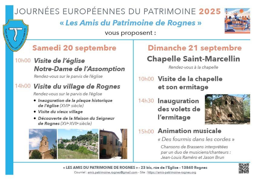 Journées du Patrimoine Journées du Patrimoine - Rognes Du 20/09/2025 au 21/09/2025 Publié par Pauline . le 03/09/2024 - Modifié le 28/08/25 13:31 par quefaireenfamilledanslevar 03/09/2024 Rendez-vous les 20 et 21 septembre pour les Journées du Patrimoine à Rognes. L’association Les Amis du Patrimoine de Rognes vous propose un programme riche et varié.Samedi 20 septembre à 10h, visite de l’église, et à 14h, visite du village avec l’inauguration de la plaque historique de l’église entre autres.Dimanche 21 septembre rendez-vous à la chapelle St Marcellin à partir de 10h… Toute la programmation des Journées du Patrimoine dans la Région PACA : Les Journées du Patrimoine 2025 en région Provence Alpes Côte d'Azur Les Journées Européennes du patrimoine auront lieu le weekend du 20 et 21 septembre 2025. Le programme complet dans le Var et les Bouches-du-Rhône. Tous publics Du 20 septembre au 21 septembre 2025 Terminé Tous publics Chapelle Saint Marcellin RD 543, 13840 Rognes 04 42 50 13 36 FacebookTwitterEmail A découvrir également 15 jours pour profiter du Muséum départemental du Var avant sa fermeture Les temps forts à ne pas rater ce week-end du 18 et 19 octobre dans le Var 10 idées de sorties avec les enfants pendant les vacances d'automne dans le Var Disney en concert - Autour du monde à Toulon Idée de sortie en famille : Pour une Aventure Nature direction Aoubré Woofest s'installe à Nice : Le premier festival animalier fait escale sur la Colline du Château Sanary s'amuse pendant les vacances de la Toussaint Ollioules célèbre la 34e Fête de l'Olivier les 4 et 5 octobre 7 sites départementaux à (re)découvrir dans le Var pour les Journées du Patrimoine