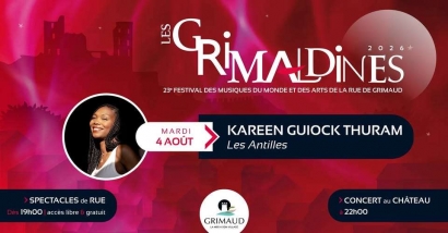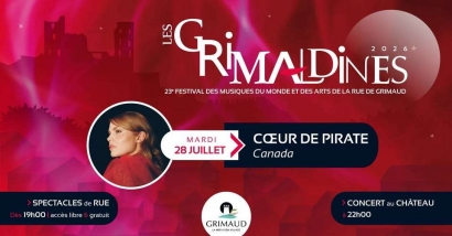 concert festival world music Festival Les Grimaldines Du 21/07/2026 au 04/08/2026 Publié par Guillaume LELARD le 07/04/2026 par quefaireenfamilledanslevar 07/04/2026 Rendez-vous du 21 juillet au 4 août pour la nouvelle édition du Festival les Grimaldines. Les Grimaldines ce sont des spectacles truculents avec des artistes investis et détonants. Chanteurs, musiciens ou acrobates vous divertissent chaque année pour une édition toujours plus réussie.Les Grimaldines c'est un rendez-vous estivale avec une programmation éclectique et lumineuse à souhait, et la diversité festive qui est proposée dans les rues et places du village. Spectacles de rue et grands concerts, un alliage atypique sans équivalent dans la région.Festival de musiques du Monde et des arts de la rue, il n’a son pareil nulle part ailleurs dans le Golfe de St Tropez. Au programme de l'édition 2026Comme chaque année, le Théâtre du Château de Grimaud reçoit une belle programmation avec cette année :Mardi 21 juillet 2026 : Selah Sue and The Gallands Selah Sue and The Gallands Une voix unique, une énergie brute et des vibes soul qui électrisent la scène, Selah Sue en concert le 21 juillet au Théâtre du Château. Mardi 28 juillet 2026 : Coeur de Pirate Coeur de Pirate Plus de 15 ans de tubes, d'albums et d'émotions, Coeur de Pirate investit la scène du Théâtre du Château, le 28 juillet à 22h. Mardi 4 août 2026 : Kareen Guiock Thuram Kareen Guiock Thuram Kareen Guiock Thuram, une énergie contagieuse, une authenticité rare, un charisme qui électrise le public et un visage familier que l'on retrouve avec plaisir, sur la scène du Théâtre du Château le 4 août, inratable ! Mardi 11 août 2026 : Ayom Ayom Ayom, trois percussionnistes, une voix puissante et envoûtante au centre du spectacle portée par Jabu Morale et des grooves qui vous transportent du Brésil à l'Afrique, du Portugal à l'Italie. 𝗔𝗩𝗔𝗡𝗧 𝗟𝗘S 𝗖𝗢𝗡𝗖𝗘𝗥𝗧SRetrouvez dès 19h00 de nombreux spectacles dans les rues toujours plus festifs ! Sans oublier les jeux en bois "Fou des jeux" et la restauration sur place pour contenter les estomacs.Dans les rues, de 19h00 à 23h00Infos/billetterie en ligne : www.les-grimaldines.comComment venir ?Avec des navettes gratuites :Laissez votre voiture au parking, prenez la navette, et profitez de votre soirée en toute tranquillité.Navettes en circulation de 18h à 01h, rotation toutes les 15min.Les navettes desserviront 5 points d’arrêt :– Port Grimaud (au niveau du parking face l’entrée de Port Grimaud 1)– Port Grimaud (au niveau du rond-point, à l’arrêt de bus habituel)– Complexe sportif des Blaquières (parking gratuit)– Cave vinicole– Village de Grimaud (à l’Office de Tourisme) Les festivités de l'été à Grimaud Terminé le village de Grimaud et Port-Grimaud proposent un programme de festivités pour cet été 2025. Tous publics Du 21 juillet au 4 août 2026 19h A partir de 20€ Tous publics Théâtre du Château Château de Grimaud Grimaud FacebookTwitterEmail A découvrir également Vacances de printemps dans le Var et les Alpes-Maritimes : le guide des sorties en famille Samedis en fête revient le 4 avril à Toulon avec Baleti, chasse aux oeufs, parades, animations... Que faire pendant les vacances de février avec les enfants ? Que faire avec des enfants à Toulon ? 10 idées de sorties en famille Carnavals d'ici et d'ailleurs, une exposition à découvrir en famille dans le Var Les Studios Rembrandt pour expérimenter en famille à Draguignan Palomano ouvre à Puget-sur-Argens un nouveau parc ludo-éducatif pour les enfants ! Sur la Côte d'Azur, 40 musées et monuments ouvrent grand leurs portes lors de Mon Week-end aux Musées De belles chutes de neige dans les Alpes du Sud : La météo des neiges de ce weekend du 10 et 11 janvier