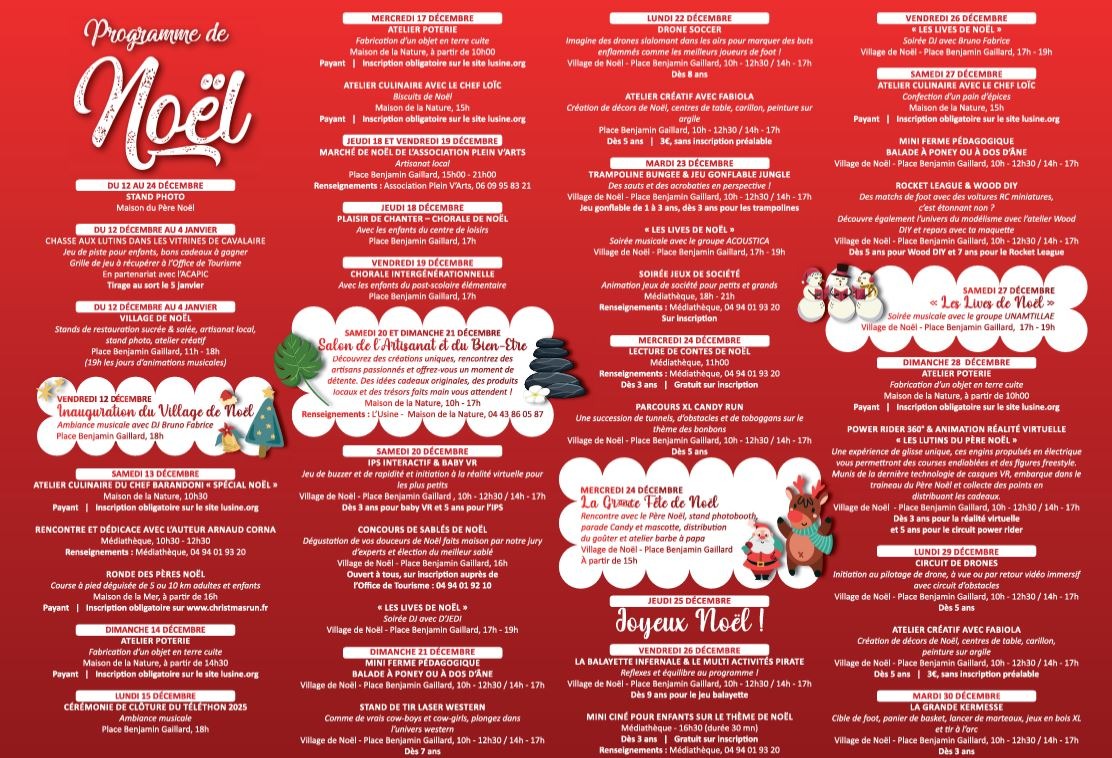 Spectacle en famille Feu d'artifice loisir Noël Noël à Cavalaire sur Mer Du 30/11/2025 au 04/01/2026 Publié par Redac . le 31/10/2025 par quefaireenfamilledanslevar 31/10/2025 La ville de Cavalaire vous invite à vivre un "Noël enchanté" au fil d'animations telles que : Spectacles, marché de Noël, feu d'artifice... L'esprit des fêtes de fin d'année s'installe progressivement et le cœur de la ville se pare de ses plus beaux atours pour accueillir les festivités. Familles, jeunes, sportifs ... il y en aura pour tous les goûts! Les incontournables La boite aux lettres du Père Noël - 1er au 24 décembre 2025 Les enfants peuvent déposer leurs lettres et leurs listes de Cadeaux à l'attention du Père Noël dans la jolie boîte aux lettres aux couleurs de Noël...La boîte aux Lettres du Père Noël est entièrement dédiée aux enfants ! Ils doivent bien renseigner leurs adresses postales pour que le Père Noël puisse leur répondre ! ROND POINT SAINT EXUPÉRY ************ Lancement des Illuminations et Apéro Concert - 5 décembre 2025 Véritable point de départ des festivités de Noël à Cavalaire, la Ville, le pôle événementiel de la SPL MAURES EVENEMENTS et l’association des commerçants organisent un apéro scène spécial « lancement des illuminations de Noël » Apéritifs et dégustations proposés par l’association des commerçants, déambulations musicales et soirée DJ animeront cette belle soirée sans oublier bien sûr l’illumination du grand sapin du village de Noël et de toutes les décorations du centre-ville. Vendredi 5 décembre 2025 - 18hRond pont Saint Exupéry ************ Vente de jouets : Du coeur dans les épinards - 5 & 6 décembre 2025 Vente de jouets par l'association "Du Coeur dans les Epinards" Pour des achats plus responsables, choisissez la seconde main ! Et vous ferez en plus une bonne action puisque tous les bénéfices iront à l'association "Du Coeur dans les Epinards" Vente de jouets uniquement ! Pensez à faire vos cadeaux de Noël ! Du vendredi 5 au samedi 6 décembre 2025 de 14h à 20hRond-Point Saint ExupéryMaison de la Mer Le marché de Noël - 12 décembre 2025 au 4 janvier 2026 Marché de Noël - Cavalaire sur Mer Rendez-vous du 12 décembre 2025 au 4 janvier 2026 sur l'Avenue Maréchal Lyautey, pour découvrir le village de Noël. ************ Christmas run, la Ronde des Pères Noël - 13 décembre 2025 Course pédestre familiale, festive et déguisée Christmas Run La Christmas run, la plus grande course de pères Noël de la région sud organisée en ouverture des fêtes de fin d'année, le 13 décembre à Cavalaire-sur-Mer. ************ Le Noël gourmand - 18 & 19 décembre 2025 Nous accueillerons l'association "Plein V'Arts" et ses commerçants sur le Boulodrome Place Benjamin Gaillard durant deux jours. Artisanat locale et produits du coin au rendez-vous pour faire vos dernières emplettes avant Noël. Le Noël Gourmand : Marché de NoëlAvenue Maréchal LyauteyDu jeudi 18 au vendredi 19 décembre 2025 de 15h à 21h. ************ La Chorale de Noël - 18 décembre 2025 La talentueuse Chorale "Plaisir de chanter" se joint aux enfants du centre de loisirs pour un véritablement moment de plaisir partagé sur le Village de Noël. Plaisir de chanter - La Chorale de NoëlAvenue Maréchal LyauteyJeudi 18 décembre 2025 - 17h ************ Chorale intergénérationnelle - 19 décembre 2025 Chorale intergénérationnelle avec la participation des enfants du post scolaire élémentaire et de la chorale des AVF. Vendredi 19 décembre 2025 à partir de 17h.Avenue Maréchal LyauteyGratuit. Chapeau présenté à la sortie ************ IPS interactif et Baby VR - 20 décembre 2025 Une animation IPS interactive qui consiste à buzzer les plots le plus possible pour gagner la partie. Les plus petits pourront s'initier à la réalité virtuelle sur des consoles très rigolottes. Le Noël Gourmand: IPS interactif et Baby VRAvenue Maréchal LyauteySamedi 20 décembre 2025De 10h à 12h30 et de 14h à 17hGratuit ************ Les Lives de Noël - 20 décembre 2025 ambiance musicale sur le village de Noël C'est l'artiste DJ "D'Jedi" qui se chargera de mettre l'ambiance avec des sons des années 80 à nos jours pour cette première soirée sur le village. Gratuit. Consommations sur le village de Noël payantesSamedi 20 décembre 2025.De 17h à 19hAvenue Maréchal Lyautey ************ La mini ferme pédagogique, balades en calèche, à poney et à dos d'âne - 21 décembre 2025 au 3 janvier 2026 Le Ranch de la Mène et Tis'Anes vous proposent 3 journées durant les vacances scolaires au plus proche des animaux. Au travers de la mini ferme pédagogique, les enfants et les plus grands pourront approcher les animaux, âne, mouton, chèvre, lapin, poules et lama. Les animateurs pourront répondre à leurs questions...Des balades en calèche seront proposées ainsi qu'à dos d'ânes et à poney. Dimanche 21 décembre 2025. De 10h à 12h30 et de 14h à 17h.Samedi 27 décembre 2025. De 10h à 12h30 et de 14h à 17h.Samedi 3 janvier 2026. De 10h à 12h30 et de 14h à 17h. Reporté en cas de mauvais temps ************ Stand de tir laser Western - 21 décembre 2025 Un stand de tir western super réaliste avec des carabines laser et des musiques country destiné aux cowboys et cowgirls en herbe ! Dimanche 21 décembre 2025.De 10h à 12h30 et de 14h à 17hAvenue Maréchal Lyautey ************ Drones Soccer - 22 décembre 2025 Imaginez des drones slalomant dans les airs pour marquer des buts enflammés comme Mbappe ! Découvrez ce nouveau E-Sport et plongez dans l’univers déjanté du " Drone Soccer " ! Dirigés par un télépilote de drone professionnel, de son assistant, et équipés des derniers drones spécialement conçus pour l'initiation, vous serez à même de piloter en quelques minutes votre drone soccer et de découvrir ainsi les fabuleuses sensations de ce nouveau jeu d'équipe (2 contre 2).L'animation étant ouverte à un public âgé d