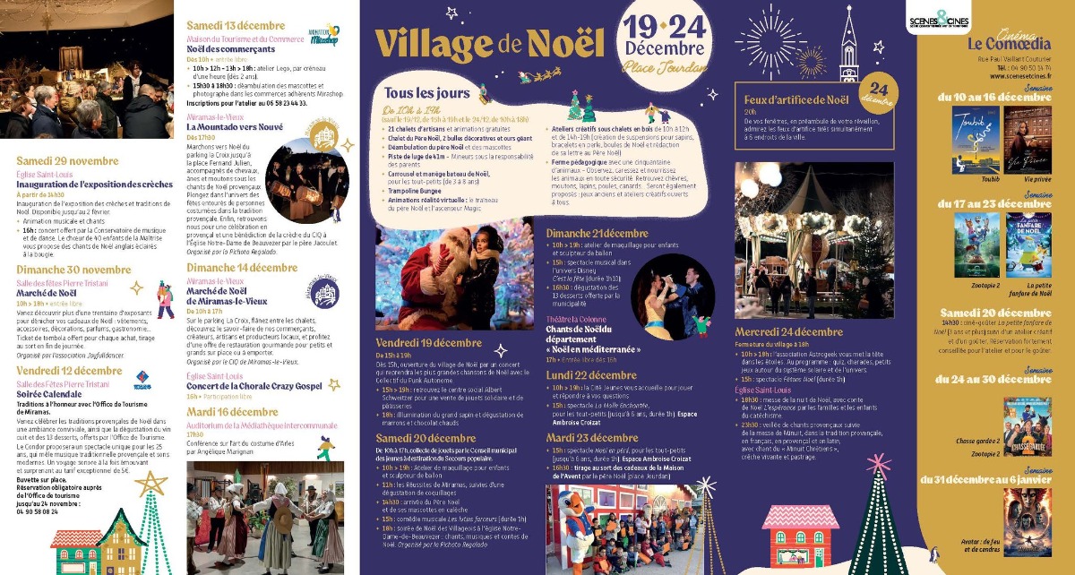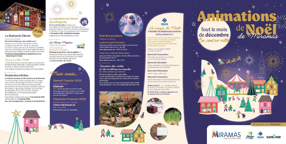 Spectacle gratuit en famille Festivités Feu d'artifice Noël Noël à Miramas Parades, spectacles, marchés, ateliers pour les enfants, feu d'artifice... Noël c'est tout un programme à Miramas ! Publié par webmaster webmaster le 17/10/2025 par quefaireenfamilledanslevar 17/10/2025 Du 1er au 24 décembre, la Ville de Miramas invite petits et grands à célébrer les traditions et l’esprit de Noël sur la place Jourdan. Un programme festif et gratuit, partagé avec l’Office de tourisme, l’association de commerçants Mirashop et les acteurs de la culture. Retrouvez le programme complet, lieu par lieu : place Jourdan, église Saint-Louis, salle Colomb, centre-ville, la Maison et le calendrier de l'Avent, feux d'artifice chez vous, théâtre La Colonne... Au programme Le marché de Noël spécial Joyfull Dancer - 30 novembre 2025 Nombreux exposants locaux pour dénicher vos cadeaux de Noël : jouets, décorations, produits de beauté, plantes, miel, vêtements... Petite collation et ticket de tombola offerts à chaque acheteur (entrée gratuite). Dimanche 30 novembre 2025Salle ColombDe 9h à 18h - Marché de Noël de l'association Joyfull Dancer Marché de Noël de l'association Joyfull Dancer Ateliers de Noël à la Maison du Tourisme et du Commerce - 26 novembre au 17 décembre 2025 Dès la fin du mois de novembre, la magie de Noël s’installe à l’Office de Tourisme de Miramas ! Les enfants de 6 à 10 ans sont invités à participer à des ateliers créatifs et ludiques, pour plonger dans l’ambiance féérique des fêtes. Programme des ateliers (14h30-15h30) Mercredi 26 novembre : fabrication de sucettes en chocolat avec la Pâtisserie Argiolas Mercredi 3 décembre : plantation du blé de la Sainte-Barbe et décoration du sapin de Noël Mercredi 10 décembre : atelier « Lettre au Père Noël » Mercredi 17 décembre : atelier Kamishibaï (théâtre d’image) avec le Centre Social Albert Schweitzer Ateliers gratuits - sur inscription auprès de l’Office de Tourisme à partir du lundi 3 novembre.Les enfants doivent être accompagnés d’un adulte. La magie de Noël s'installe à la Maison du Tourisme et du Commerce ! Concours - La ronde des crèches provençales 2025 Nous vous attendons jusqu’au 24 décembre pour la 22e édition du Concours de Crèches Provençales de Noël. Rendez-vous le 24 janvier pour connaître les 3 coups de cœur du jury et partager la galette des rois. Depuis 22 ans, le jury de l’Office de tourisme s’invite dans les foyers miramasséens pour de beaux moments de partage et de convivialité, mais aussi pour apprécier leur imagination et la transmission des valeurs provençales. âžœ Bulletin d'inscription disponible en téléchargement Inscriptions ouvertes du 24 novembre au 24 décembre 2025.Tournée des crèches du 5 au 9 janvier 2026.Remise des prix le 23 janvier 2026. Fêtez Noël avec vos commerçants - tout le mois de décembre 2025 Tout le mois de décembre, retrouvez le jeu de la « vitrine mystère » à la Maison du Tourisme et du Commerce. Devinez le prix total des produits exposés pour tenter de remporter des chèques Mirashop. Samedi 13 décembre : à partir de 14h, animation Lego à la Maison du Tourisme (inscriptions au 04 90 58 08 24) et mini-parade avec mascottes et photographe dans les commerces Mirashop. Noël des commerçants La Maison de l’Avent - 1er au 24 décembre 2025 Tirage au sort le 23 décembre à 16h30 sur la place Jourdan pour tenter de gagner l’un des 24 cadeaux mis en jeu. Bulletins disponibles chez vos commerçants et en mairie. * Présence indispensable pour prétendre aux lots. Réservé aux 4-10 ans. Le calendrier de l’Avent des villageois - 1er au 23 décembre 2025 Chaque jour, une fenêtre s’illumine laissant découvrir une décoration réalisée par une famille. À partir du 24 décembre, toutes les fenêtres seront illuminées ! Tirage au sort le 23 décembre à 16h30 place Jourdan, en présence du Père Noël. Écrire au Père Noël Le Père Noël répond à tous les enfants qui déposent leur lettre dans la boîte devant la mairie, à côté de la Maison de l’Avent. (Nom, prénom et adresse obligatoires.) La soirée calendale - 12 décembre 2025 Vendredi 12 décembre à 19h, salle des fêtes Tristani. Soirée provençale conviviale avec vin cuit, 13 desserts et spectacle « Le Condor » (musique traditionnelle et sons modernes). Buvette sur place.Tarif : 5 € - Réservation obligatoire auprès de l’Office de Tourisme (04 90 58 08 24) du 14 octobre au 24 novembre. Soirée Calendale à Miramas Le Village de Noël - 19 au 24 décembre 2025 Vendredi 19 décembre 15h : ouverture du village et concert du Collectif du Punk Autonome.18h : illumination du grand sapin et dégustation de marrons et chocolat chauds. Samedi 20 décembre 10h : ouverture du village, collecte de jouets (10h à 17h) 10h-19h : ateliers créatifs, maquillage enfants, sculpteur de ballons 14h30 : arrivée du Père Noël en calèche 15h : comédie musicale Les Lutins Farceurs 18h : soirée de Noël des Villageois à l’église Notre-Dame de Beauvezer Dimanche 21 décembre 10h : ouverture du village et déambulation du Père Noël 15h : spectacle musical C’est la fête (univers Disney) 16h30 : dégustation des 13 desserts offerte par la municipalité Lundi 22 décembre 10h : ouverture du village, présence de la Cité Jeune 15h : spectacle La Malle Enchantée, Espace Ambroise Croizat Mardi 23 décembre 10h : ouverture du village 15h : spectacle Noël en péril, Espace Ambroise Croizat 16h : tirage au sort des cadeaux de la Maison de l’Avent (place Jourdan) Mercredi 24 décembre 10h : ouverture du village, animations Astrogeek 15h : spectacle Fêtons Noël 18h30 : messe de la nuit de Noël à l’église Saint-Louis 20h : feux d’artifice de Noël (6 sites de tir simultanés) 23h30 : veillée de chants provençaux et messe de Minuit Village de Noël - Miramas Le feu d'artifice - 24 décembre 2025 20h : admirez les 