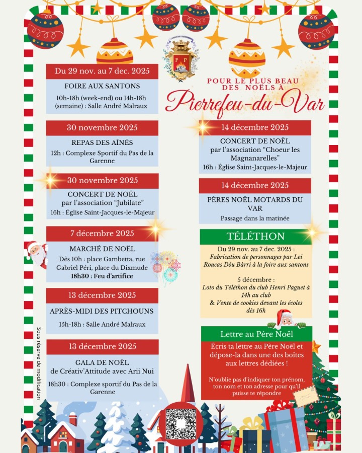 gratuit en famille Festivités Noël Noël à Pierrefeu du Var Du 28/11/2025 au 04/01/2026 Publié par Sylvie B le 20/11/2025 par quefaireenfamilledanslevar 20/11/2025 Foire aux santons, spectacles... au programme de Noël à Pierrefeu. La Foire aux santons - 29 novembre au 7 décembre 2024 Foire aux Santons - Pierrefeu du Var Les santons de Provence c'est de la magie en plus à Noël, découvrez ou redécouvrez l'art santonnier, du 29 novembre au 7 décembre Salle Malraux à Pierrefeu. ******** Concert de Noël - 30 novembre 2025 Le programme de cette année est « Terribilis Est Locus Iste », ce lieu est extraordinaire, soit pour 2 solistes a cappella, soit pour 4 solistes dont les solos de YAN ZAWACKI sont accompagnés à l’orgue par Angélique KRIEGER ou LIDIA KAWECKA. Dimanche 30 novembre 2025 - 16hEglise de PierrefeuParticipation 10€ ******** Loto du Téléthon - 5 décembre 2025 Ouvert à tous…Merci de venir nombreux pour cette noble cause, la totalité de la recette sera versée au profit du Téléthon, nous comptons sur vous ! ven. 05 décembre 202514h au club Club Henri Paguet ******** *Marché de Noël et feu d'artifice - 7 décembre 2024 Marché de Noël et feu d'artifice - Pierrefeu du Var Rendez-vous le 7 décembre à Pierrefeu du Var pour un marché de Noël assorti d'animations pour tous, dont un feu d'artifice. ******** Après-midi des Pitchouns - 13 décembre 2025 Des jeux, un spectacle et la visite du Père-Noël... 15h00 à 18h00Salle André MalrauxEspace Bouchonnerie Avenue des Poilus83390 Pierrefeu-du-Var ******** Gala de Noël - 13 décembre 2025 Gala de Noël de Créativ’AttitudeAvec l'association "ARII NUI", aux couleurs de la Polynésie sam. 13 décembre 2025 18h30Complexe sportif du pas de la garenneEntrée 5€ (placement libre) ******** Le programme complet >Infos : www.pierrefeu-du-var.fr Les festivités de Noël dans le Var et les Alpes maritimes : Les festivités de Noël dans le Var et les Alpes Maritimes Retrouvez le programme des festivités de Noël dans le Var et les Alpes Maritimes. Tous publics Du 28 novembre 2025 au 4 janvier 2026 Tous publics Centre-Ville Centre-Ville Pierrefeu-du-Var FacebookTwitterEmail A découvrir également Les Patinoires de Noël en Paca Vivez Provence: deux jours 100% Provence les 8 et 9 novembre à Sainte-Maxime Halloween & Jeux d'Automne : les temps forts de la semaine à Cavalaire-sur-Mer Les temps forts à ne pas rater ce week-end dans le Var 15 jours pour profiter du Muséum départemental du Var avant sa fermeture Les temps forts à ne pas rater ce week-end du 18 et 19 octobre dans le Var 10 idées de sorties avec les enfants pendant les vacances d'automne dans le Var Disney en concert - Autour du monde à Toulon Idée de sortie en famille : Pour une Aventure Nature direction Aoubré