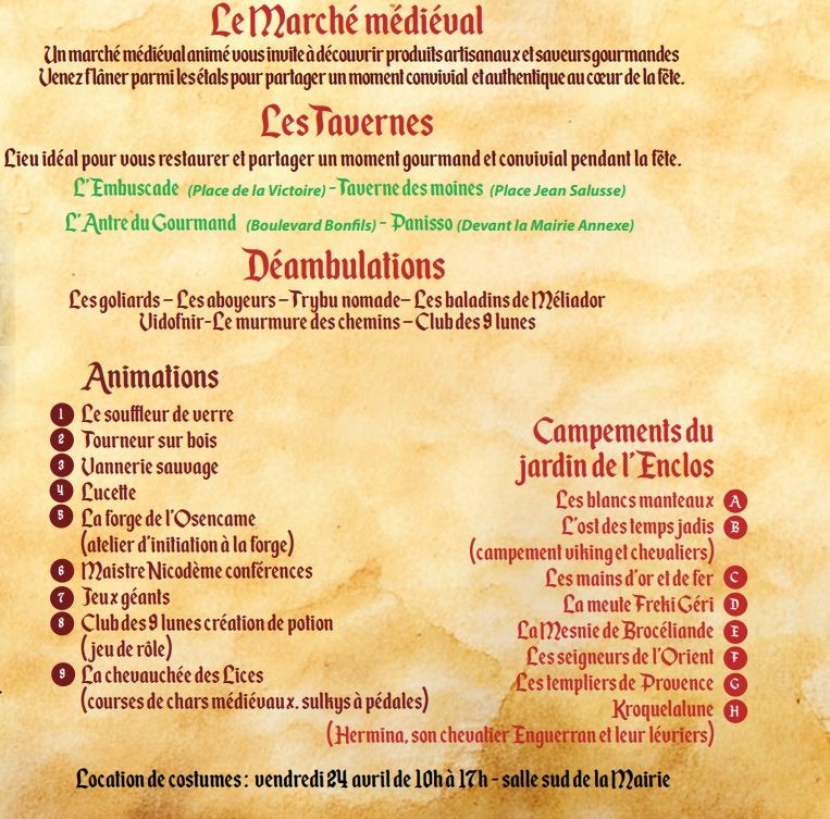 Spectacle gratuit en famille Arts de rue Festivités loisir Fête Médiévale - Saint-Maximin-la-Sainte-Baume Du 25/04/2026 au 26/04/2026 Publié par Service Communication Mairie de St-Maximin-la-Ste-Baume le 14/04/2026 par quefaireenfamilledanslevar 14/04/2026 La nouvelle édition de la Fête Médiévale de Saint-Maximin vous attend les 25 et 26 avril avec un florilège d'animations pour toute la famille : spectacles, campements, artisanat, démonstrations... La Fête médiévale se déroule au cœur de la cité avec pour objectif de valoriser le patrimoine saint-maximinois de façon ludique à la manière "dont on vivait autrefois". À travers la mise en valeur des pratiques de la vie quotidienne moyen-âgeuse, cet évènement familial permettra à tous de plonger dans le passé.Campements, danses, chants, contes, artisanat seront au programme de ces journées de fête, avec de nombreuses animations pour les enfants.Le programme 2026 de la Fête médiévale Samedi 25 avril- 10h : Ouverture de la fête- 11h : Conférence sur le patrimoine religieux architectural de Saint-Maximin. Sacristie de la basilique (sur réservation auprès de l’accueil de la mairie) Le cortège s’élance ! Départ : Jardin de l’Enclos Arithmancia Place Malherbe- 11h30 : Présentation des troupes. Parvis de la Basilique Chers convives, rendez-vous dans les tavernes pour partager festin et convivialité en l’honneur de cette fête !- 13h30 : *Les Goliards Parvis de la Basilique *Trybu nomade Place Jean Salusse*Le murmure des chemins Fontaine- 14h :*Kroquelalune Jardin de l’Enclos*Vidofnir Boulevard Bonfils*Maistre Nicodème : conférence « Les soins au moyen-âge ». Salle sud (mairie)- 14h30 :*Les Baladins de Méliador Parvis de la basilique*Les aboyeurs Place Malherbe- 15h : Sous le fracas des armes, le combat des chevaliers captive par sa bravoure et sa puissance spectaculaire Jardin de l’Enclos Arithmancia Place Malherbe- 15h30 : Maistre Nicodème : conférence « Histoires de revenants » Salle Sud (mairie) Trybu nomade Place Malherbe- 16h :*Les Goliards Place Jean Salusse*Kroquelalune Jardin de l’Enclos *Vidofnir Parvis de la Basilique *Le murmure des chemins Place Jean Salusse- 16h30 :*Les aboyeurs Boulevard Bonfils*Les Baladins de Méliador Place Malherbe*Maistre Nicodème : conférence « Les soins au moyen-âge ». Salle sud (mairie)- 17h : *Les Goliards Place Malherbe*Trybu nomade Parvis de la Basilique- 17h30 :*Vidofnir Place Malherbe*Le mumure des chemins Boulevard Bonfils*Kroquelalune Jardin de l’Enclos- 18h : Un affrontement spectaculaire oppose Vikings et chevaliers dans un combat épique et intense. Jardin de l’Enclos- 18h30 : *Les aboyeurs Parvis de la Basilique*Trybu nomade Place Jean Salusse*Les baladins de Méliador Place MalherbeAvant de profiter du grand spectacle, laissez-vous tenter par une pause gourmande dans les tavernes- 20h : Spectacle de feu Jardin de l’EnclosDimanche 26 avril - 10h : Ouverture de la fête - 11h :*Les Goliards Parvis de la Basilique*Trybu nomade Place Jean Salusse*Le murmure des chemins Fontaine*Arithmancia Place Malherbe- 11h30 :*Kroquelalune Jardin de l’Enclos*Vidofnir Boulevard Bonfils*Maistre Nicodème : conférence « Les soins au moyen-âge » Salle Sud (Mairie)Chers convives, rendez-vous dans les tavernes pour partager festin et convivialité en l’honneur de cette fête- 14h : Le cortège s’élance dans une explosion de couleurs et de bonne humeur ! Départ jardin de l’Enclos- 14h30 : Présentation de toutes les troupes Parvis de la Basilique- 15h :*Les Baladins de Méliador Parvis de la Basilique*Les Aboyeurs Place Malherbe*Arithmancia Place Malherbe- 15h30 :*Maistre Nicodème : conférence « Histoires de revenants » Salle Sud (Mairie) *Trybu nomade Place Malherbe*Les Goliards Place Jean Salusse*Kroquelalune Jardin de l’Enclos*Vidofnir Parvis de la Basilique*Le murmure des chemins Place Jean Salusse- 16h30 : *Les Aboyeurs Boulevard Bonfils*Les Baladins de Méliador Place Malherbe*Maistre Nicodème : conférence « Les soins au moyen-âge » Salle Sud (Mairie)- 17h :*Les Goliards Place Malherbe*Trybu nomade Parvis de la Basilique- 17h30 : *Vidofnir Place Malherbe*Le murmure des chemins Boulevard Bonfils*Kroquelalune Jardin de l’Enclos- 18h : Un affrontement spectaculaire oppose Vikings et chevaliers dans un combat épique et intense.- 18h30 : *Les Aboyeurs Jardin de l’Enclos*Trybu nomade Jardin de l’Enclos*Les Baladins de Méliador Jardin de l’EnclosGentes dames et nobles seigneurs, la liesse s’achève ; que chacun regagne son logis le cœur en joie !Et Aussi : Concours de dessins Dessine moi un chevalier, une princesse... Participe au concours organisé par le service événementiel et tente de gagner un CADEAU surprise ! Dépose ton chef-d’œuvre (avec nom, prénom, ville, coordonnées) en Mairie aux horaires d’accueil jusqu’au Vendredi 24 avril et à l’accueil de la fête jusqu’au Samedi 25 avril. Partage le sur Facebook et Instagram avec : #saintmaximinlasaintebaume #dessinsmedievalesstmax26Concours photos Envoyez vos plus beaux clichés de la Fête au service communication : com@st-maximin.fr avant le Jeudi 30 avril et tentez de remporter un CADEAU Surprise ! ` Partagez vos photos sur Facebook et Instagram avec : #saintmaximinlasaintebaume et #medievalesstmax2026Le programme au format PDF Tous publics Du 25 avril au 26 avril 2026 09:30 GratuitGratuit Tous publics Jardin de l'Enclos 42 Boulevard Rey Saint-Maximin-la-Sainte-Baume FacebookTwitterEmail A découvrir également Vacances de printemps dans le Var et les Alpes-Maritimes : le guide des sorties en famille Samedis en fête revient le 4 avril à Toulon avec Baleti, chasse aux oeufs, parades, animations... Que faire pendant les vacances de février avec les enfants ? Que faire avec des enfants à Toulon ? 10 idées de sorties en famille Carnavals d'ici et d'ailleurs, une exposition à découvrir en famille dans le Var Les Studios Rembrandt pour expé