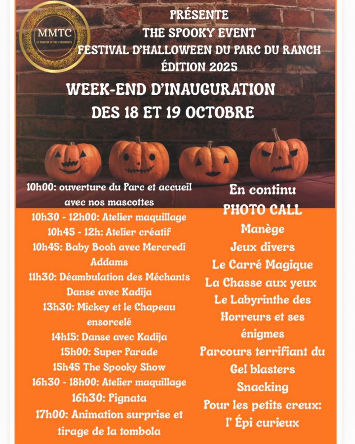 en famille loisir Festival d'Halloween au Parc du Ranch dans le Var Du 18/10/2025 au 02/11/2025 Publié par Sylvie B le 14/10/2025 par quefaireenfamilledanslevar 14/10/2025 Du 18 octobre au 2 novembre, vivez la plus grosse fête d'Halloween de la Côte d'Azur au Parc du Ranch. L’inauguration du Festival d’Halloween, édition 2025 qui se déroulera le samedi 18 octobre avec quelques nouveautés.De 10h à 18h, nous allons vous divertir avec les Shows d’Halloween, les baby booh, les déambulations de mascottes et des personnages préférés des petits et des grands et la parade; nous vous attendons toujours malicieux pour répondre aux questions de notre Labyrinthe des Mystères, participer à la Chasse aux Yeux, remporter le jeu du Carré Magique; Nous vous attendons également pour participer à la Pignata et à la tombola, à l’ Atelier Créatif et venir au Stand de maquillage, faire un tour de manège et cette année, repartir avec un merveilleux souvenir du Festival d’Halloween grâce au photo call; et n’oublions pas les instants gourmands au Snack du Parc, snacking et goûter, la zone de pique-nique et le parking toujours gratuit !Tarifs: 12 Euros pour les enfants de 2 à 12 ans et 3 Euros pourles parents … De quoi avoir envie de venir au Festival d’Halloween du Parc du Ranch Au programme Weekend d'inauguration 18 & 19 octobre 2025 Amateurs de rires et de frissons, Charlie vous présente ce soir le programme du Festival d’Halloween « The Spooky Event » du Parc du Ranch Resort.Weekend d’inauguration des 18 et 19 octobre.- 10h: ouverture du Parc et accueil avec nos mascottes- 10h30 - 12h : Atelier maquillage- 10h45 - 12h: Atelier créatif- 10h45: Baby Booh avec Mercredi Addams- 11h30: Déambulation des Méchants et Danse avec Kadija- 13h30: Mickey et le Chapeau ensorcelé- 14h15: Danse avec Kadija- 15h00: Super Parade- 15h45 The Spooky Show- 16h30 - 18h : Atelier Maquillage- 16h30: Pignata- 17h00: Animation surprise et tirage au sort de la tombola Et du 18 octobre au 2 novembre 2025 Accès et stationnement Depuis Nice par l'autoroute A8 sortie 42 "Mougins/Cannes Centre/Le Cannet", prendre D2685 (Route du Cannet) direction Cannes Centre/Le Cannet, puis suivre D809, traverser Mougins et continuer jusqu'au Cannet. En bus ligne Palmbus n°10 (passage toutes les 20 mn en semaine et toutes les 30 mn le week-end) Parking gratuit sur place Parc du Ranch275 chemin de Saint-Joseph, Le CannetRenseignements et réservations : 06 03 40 16 64 >Infos : www.leranch-de-laubarede.fr Halloween en Paca : des vacances terrifiantes! En panne d'idées pour faire d'Halloween une fête originale? Sachez que de nombreuses communes organisent des activités spéciales pour l'occasion! Suivez le guide.. Tous publics Du 18 octobre au 2 novembre 2025 10€ - 15€ Tous publics La Palestre 730 Avenue Georges Pompidou06110 Le Cannet Le Cannet 04 93 46 48 88 bienvenue@lapalestre.com FacebookTwitterEmail A découvrir également 15 jours pour profiter du Muséum départemental du Var avant sa fermeture Les temps forts à ne pas rater ce week-end du 18 et 19 octobre dans le Var 10 idées de sorties avec les enfants pendant les vacances d'automne dans le Var Disney en concert - Autour du monde à Toulon Idée de sortie en famille : Pour une Aventure Nature direction Aoubré Woofest s'installe à Nice : Le premier festival animalier fait escale sur la Colline du Château Sanary s'amuse pendant les vacances de la Toussaint Ollioules célèbre la 34e Fête de l'Olivier les 4 et 5 octobre 7 sites départementaux à (re)découvrir dans le Var pour les Journées du Patrimoine