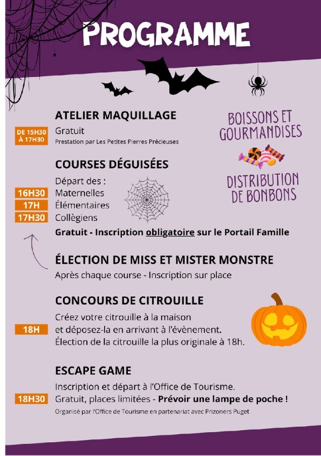 gratuit Jeune public Festivités loisir Halloween à Puget sur Argens Le 31/10/2025 Publié par Sylvie B le 13/10/2025 par quefaireenfamilledanslevar 13/10/2025 Escape game, concours de citrouille... Sortez vos plus beaux déguisements et venez fêter Halloween au Village le 31 octobre. Rendez-vous 𝘃𝗲𝗻𝗱𝗿𝗲𝗱𝗶 𝟯𝟭 𝗼𝗰𝘁𝗼𝗯𝗿𝗲 sur le parvis de l’Hôtel de Ville pour la fête la plus effrayante de l'année ! 𝗔𝘂 𝗽𝗿𝗼𝗴𝗿𝗮𝗺𝗺𝗲 : - 3 courses déguisées ouvertes aux enfants de 3 à 15 ans – premier départ 16h30 (inscription obligatoire sur le Portail Famille)- Maquillage sur place- Distribution de bonbons- Concours de citrouille- Escape game organisé par l’Office de Tourisme Intercommunal- Élection de Miss et Mister Monstre après chaque coursePréparez vos plus beaux costumes et plongez dans l’ambiance monstrueusement fun d'Halloween. Halloween en Paca : des vacances terrifiantes! En panne d'idées pour faire d'Halloween une fête originale? Sachez que de nombreuses communes organisent des activités spéciales pour l'occasion! Suivez le guide.. Tous publics vendredi 31 octobre 2025 15h30 Tous publics Centre Ville 137 Boulevard Cavalier Puget-sur-Argens FacebookTwitterEmail A découvrir également 15 jours pour profiter du Muséum départemental du Var avant sa fermeture Les temps forts à ne pas rater ce week-end du 18 et 19 octobre dans le Var 10 idées de sorties avec les enfants pendant les vacances d'automne dans le Var Disney en concert - Autour du monde à Toulon Idée de sortie en famille : Pour une Aventure Nature direction Aoubré Woofest s'installe à Nice : Le premier festival animalier fait escale sur la Colline du Château Sanary s'amuse pendant les vacances de la Toussaint Ollioules célèbre la 34e Fête de l'Olivier les 4 et 5 octobre 7 sites départementaux à (re)découvrir dans le Var pour les Journées du Patrimoine